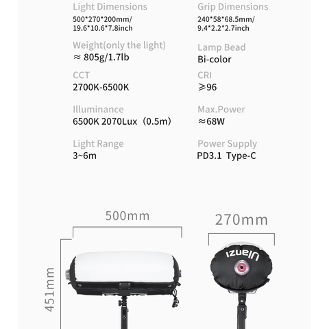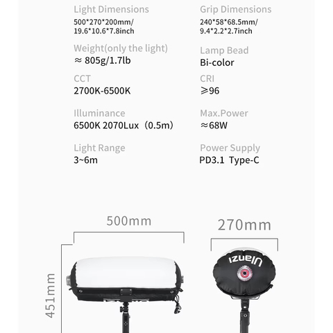 Ulanzi AL60 Надувная складная Воздушная трубка Светодиодная лампа 2700-6500K 2070Lux/0,5 м с пультом дистанционного управления для фотосъемки